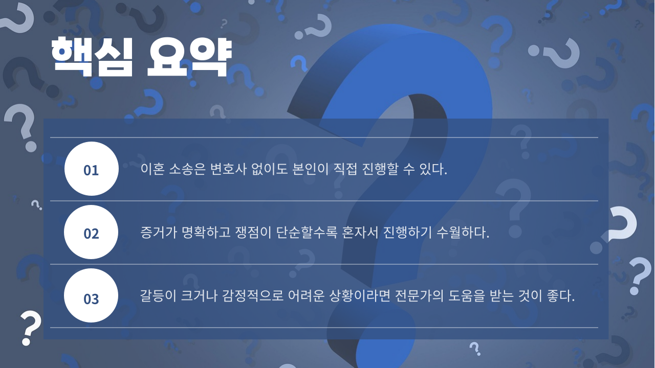 - 혼자서도 이혼 소송은 법적으로 가능하지만, 상황에 따라 전문가의 도움이 필요한 경우도 있음