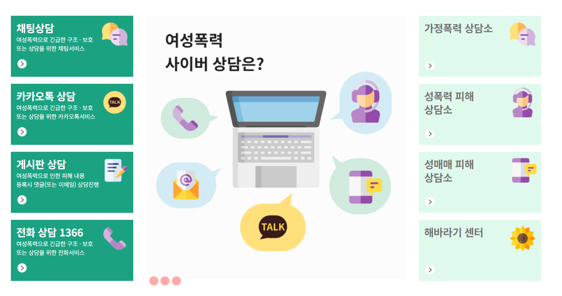 | 여성가족부 산하 1366 | 24시간 긴급 상담 및 법률 연결 |